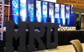 For the MRU Cougar’s Night lighting production we arranged twenty feet of black pipe and drape across the back of the stage …